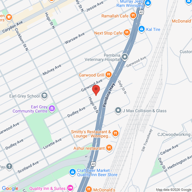 At the corner of Dudley Ave and Pembina! There is often parking right out front or on the street right beside the building.